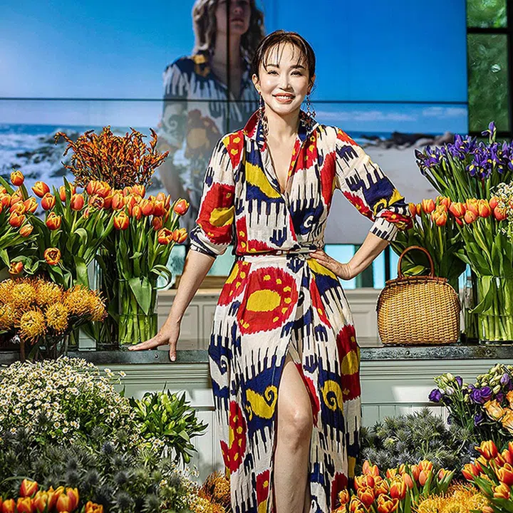 Ralph Lauren Collection今季采用了超多明艳大胆的印花及图案,灵感来自亚洲各地如Uzebkistan及Tajikistan等,同时也受到中东、非洲、拉美等地的影响。范文芳选穿花纹醒目的开衩亚麻长裙,可在行动之间不经意展露美腿。