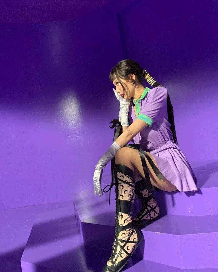 泫雅在MV中身穿Versace Polo式连衣裙劲歌热舞,脚上的Marine Serre弯月拳击靴,为青春的“网球少女look”注入一丝叛逆感。