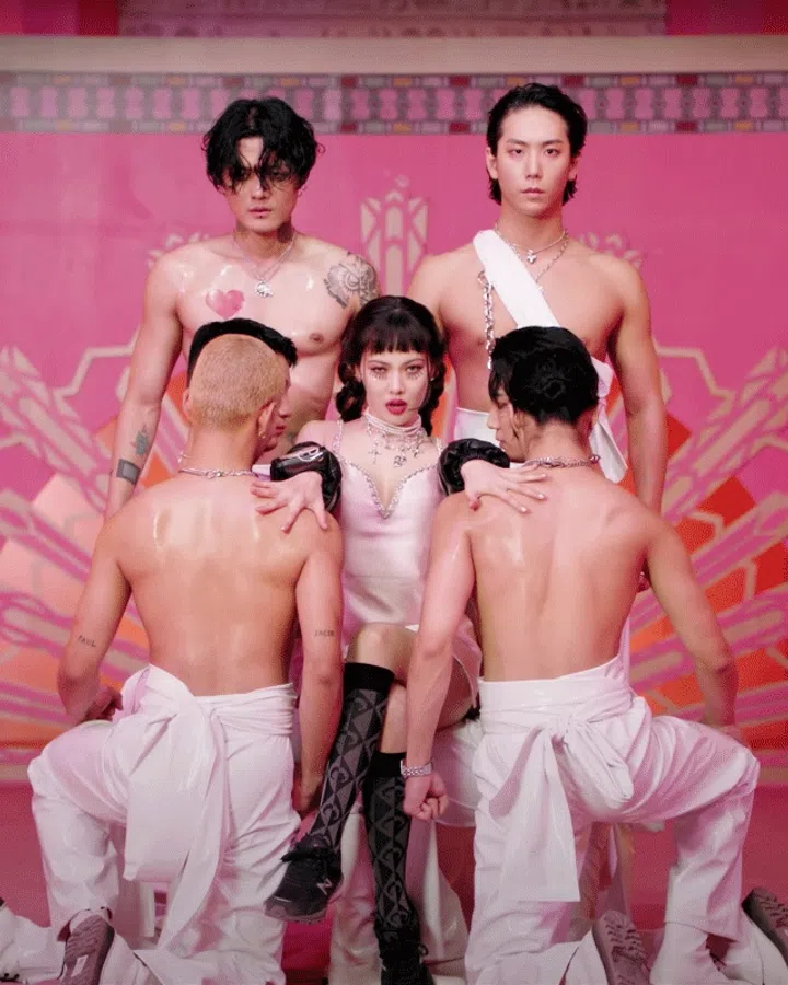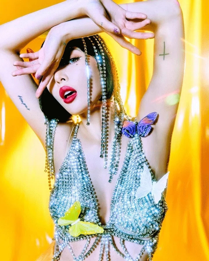 这身闪爆的水钻头饰及胸罩出自美国品牌Area,造型团队在胸罩上别了几只蝴蝶,为妩媚的造型注入一丝仙气。是否觉得有点眼熟?Blackpink成员Lisa在《Lovesick Girls》也穿过同款,但她罩在T恤当外搭,展现街头叛逆少女风。