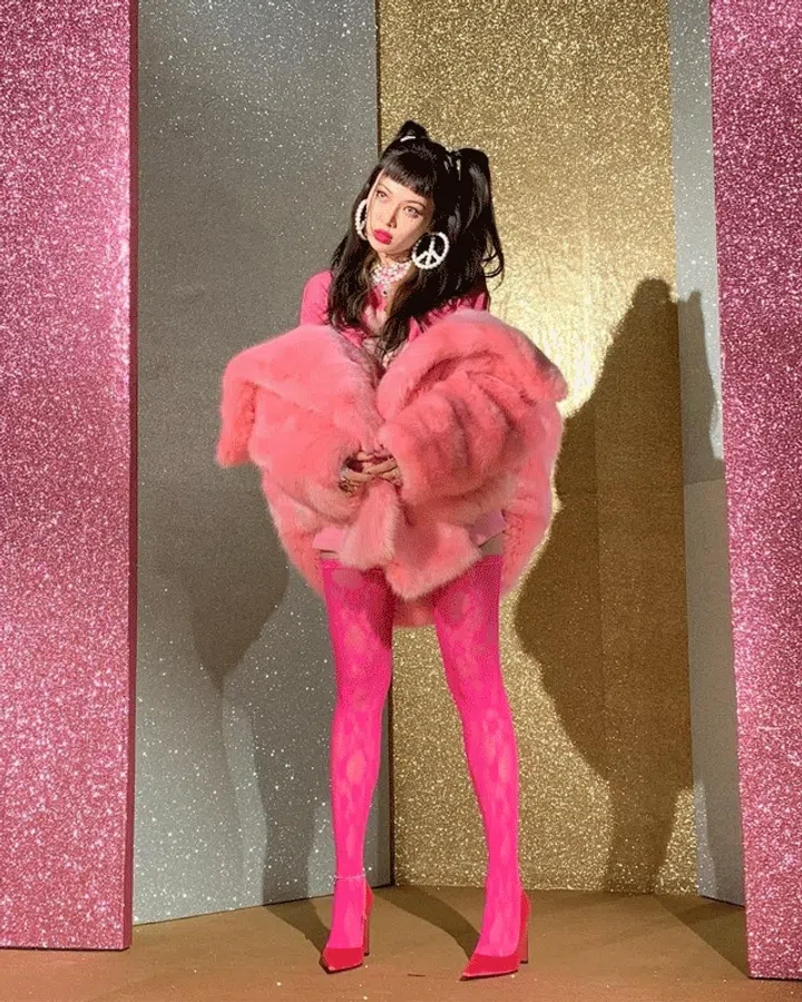 泫雅把玩性感的功力真的是超然。看似甜美的head-to-toe粉色造型,她妙用粉色蕾丝大腿袜+可爱的Chenpeng毛绒大衣,打造成性感美少女look。