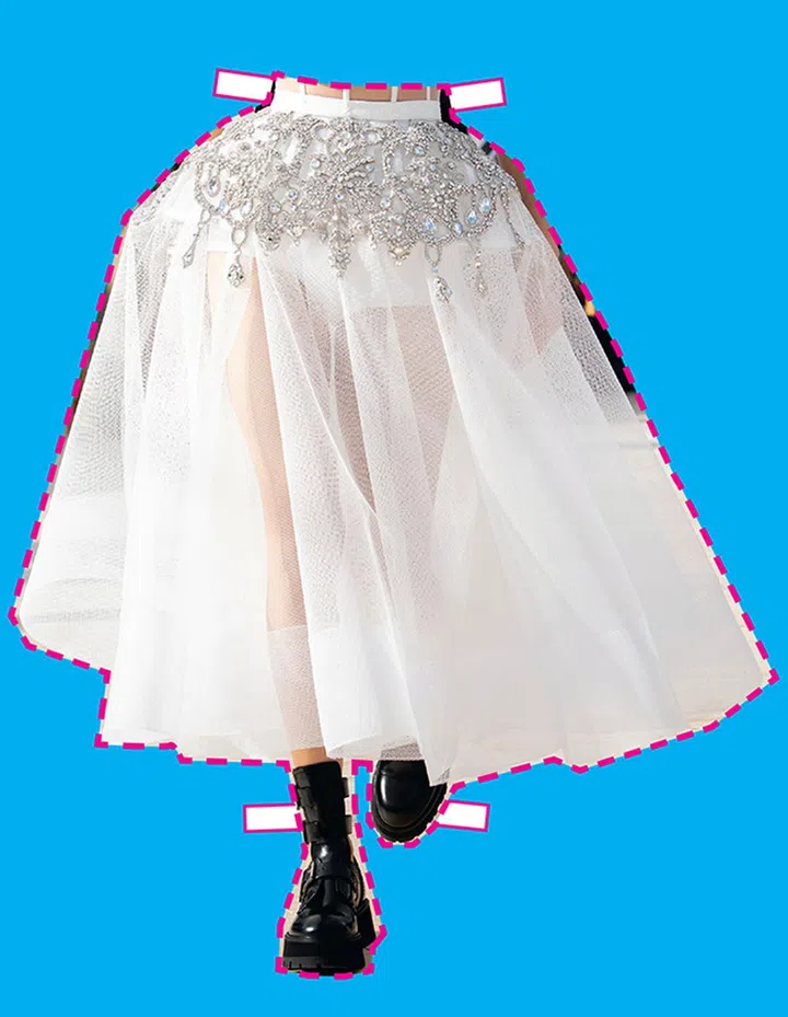 品牌今季以伦敦的天空为灵感,甚至用相机将不同时刻的天空拍下制成印花。而这款白色纱裙,以极具结构感的立体轮廓结合品牌的水晶刺绣,也不免让人想起空中飘过的白色云朵。