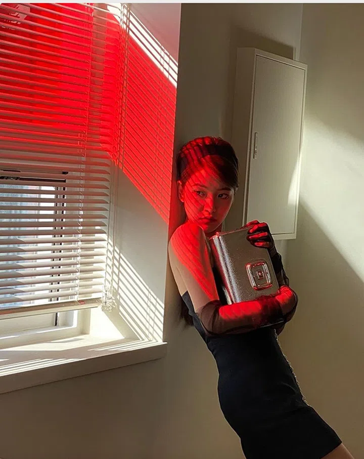 Suzy最新自拍穿着Lemaire深色西装外套搭配Acne Studios针织帽,手机壳来自Made Moment,另外搭配造型的则是Dior的高人气Saddle bag mini版手袋。