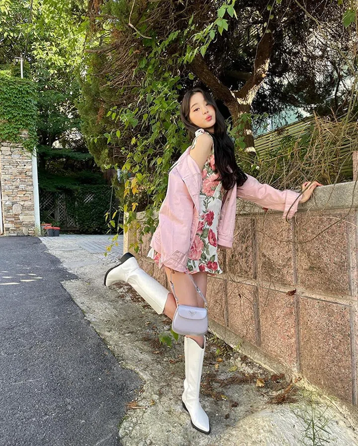年仅17岁的韩国IZ*ONE女团成员张员瑛,以花卉连衣裙搭配粉色外套和紫藤色Cleo迷你手袋,整体配色甜美,展现青春美少女的天然活泼。