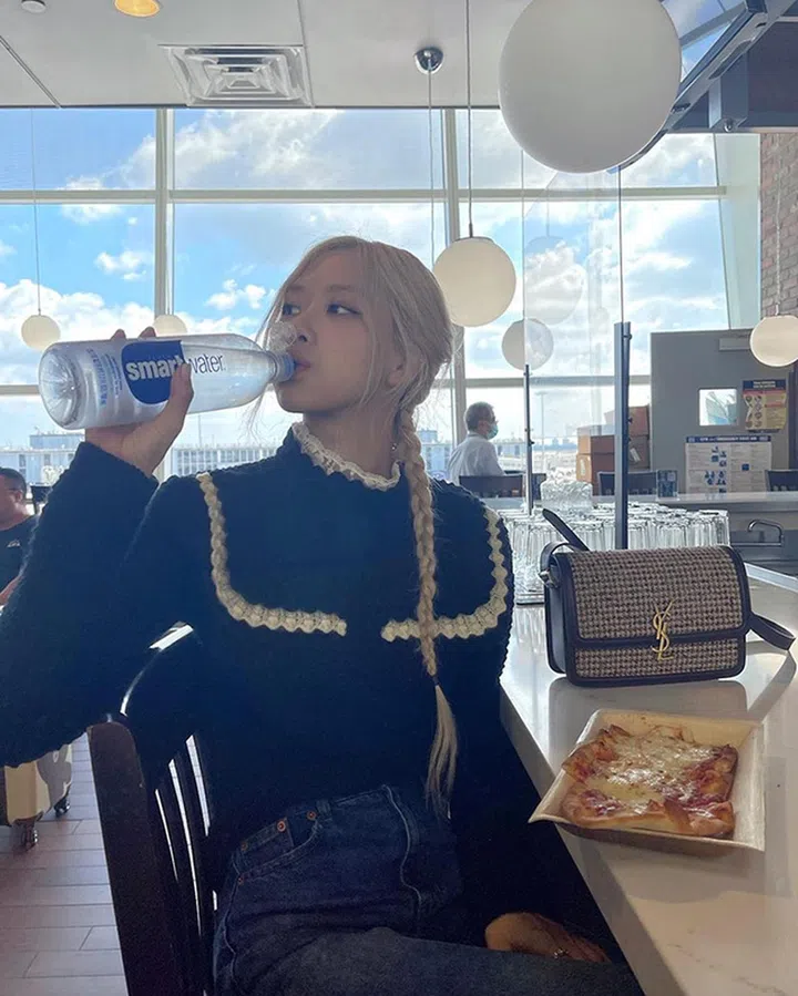 Rosé是获得Saint Laurent青睐的全球代言人(回顾:4种BLACKPINK时尚风,你是哪一派?),这款手袋是品牌的Solferino粗呢肩袋,仔细打量其实图案是混色千鸟格设计,造型经典感十足。