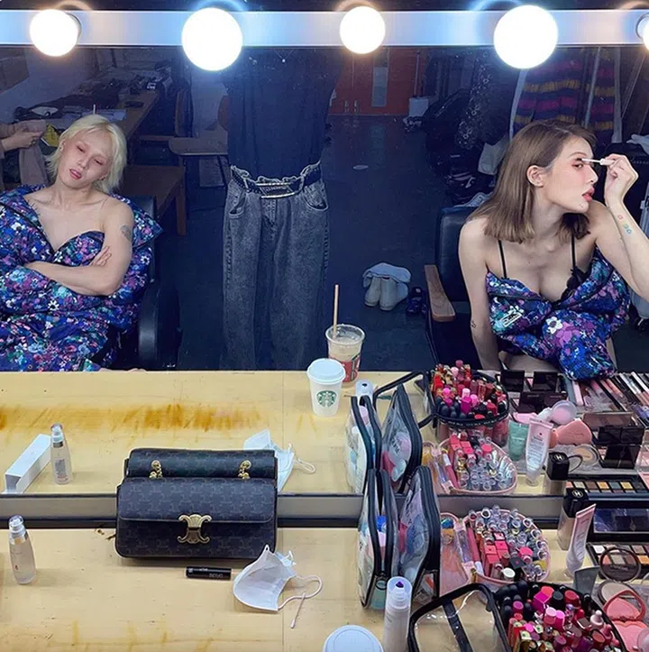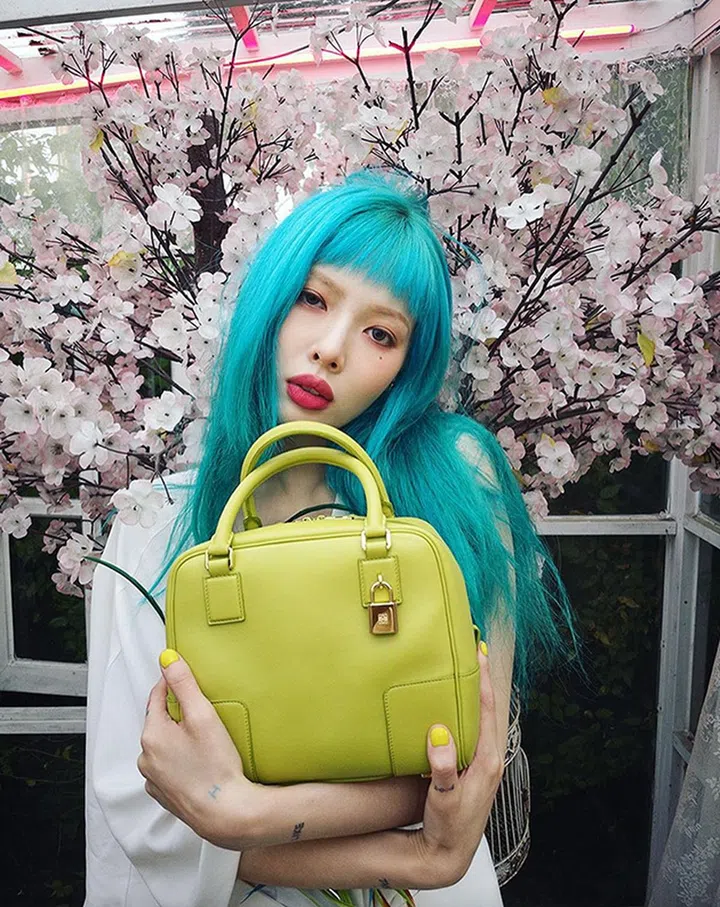 Loewe全球代言人泫雅则携带品牌新推出的Amazona 19手袋,以鲜亮的Mink色款包包搭配她的彩发,超有个性!另外,该手袋也有容量更大的长形Amazona 28袋型。