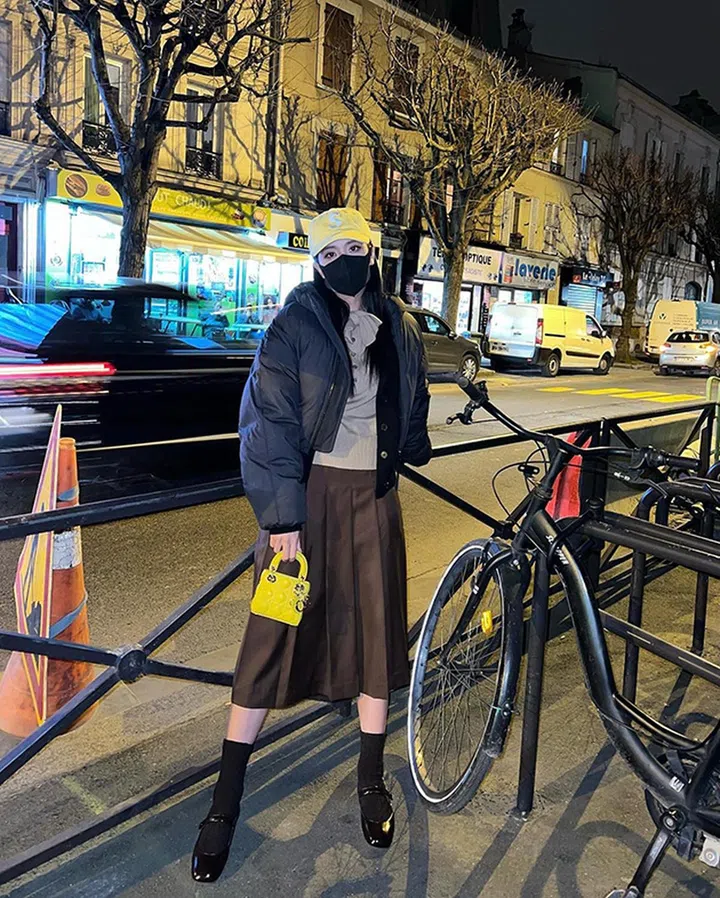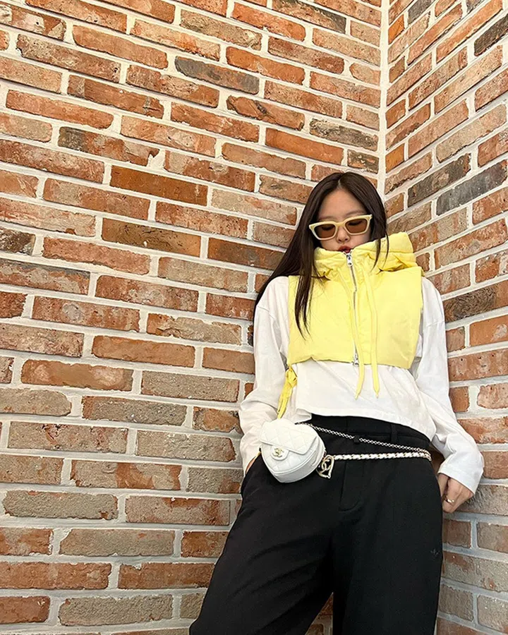 Jennie这款Chanel心形小包拥有黑、白、淡紫不同色彩(另外还有更大的粉色心形肩袋及小巧的心形腕袋),链条可用于肩背也可像她这样当作腰袋搭配。