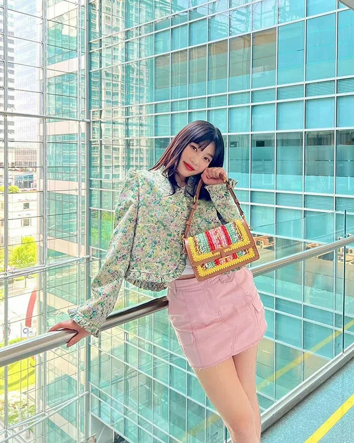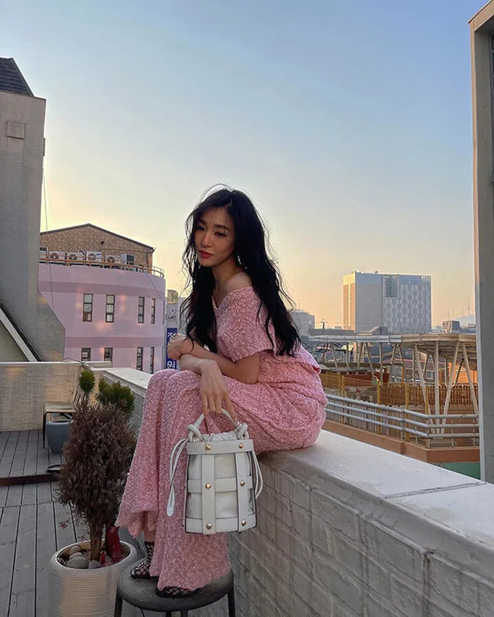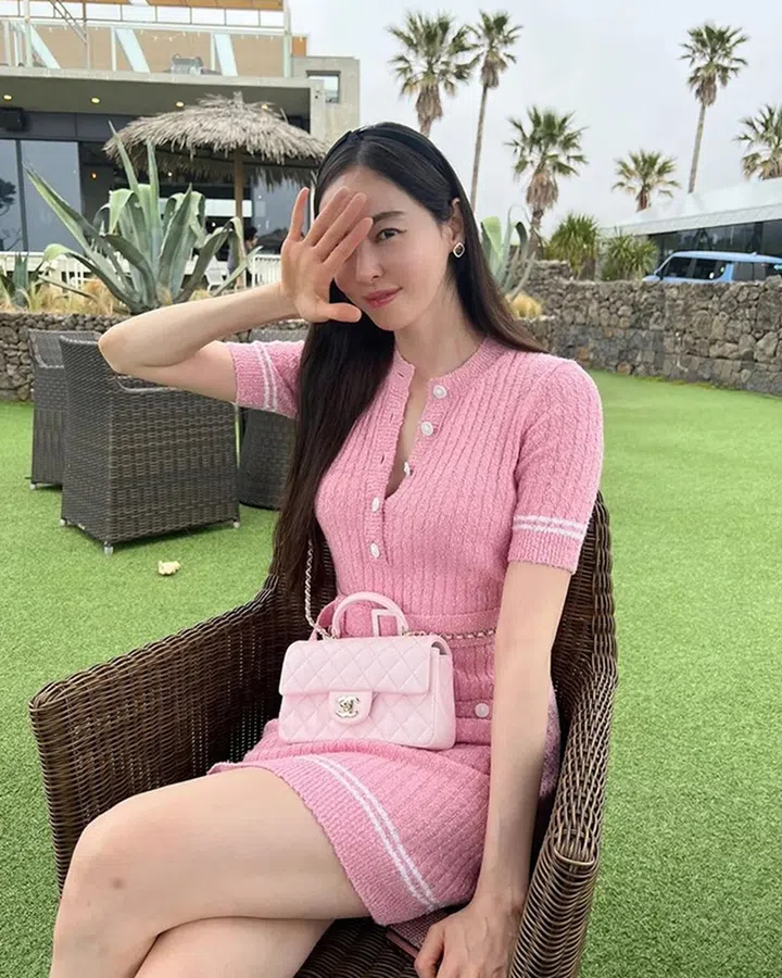 李多喜这款Chanel手袋是来自品牌今年春夏的最新设计。其色调采用pale pink,带有手柄又方便斜挎,搭配她的粉色连衣裙及小白鞋,造型淡雅又可人。