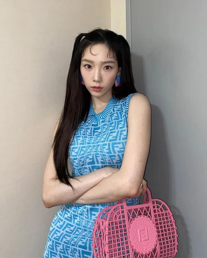 太妍身穿Fendi Vertigo扭曲FF老花纹连衣裙,搭配品牌春夏系列的“菜篮”包,展现俏皮可爱的一面。