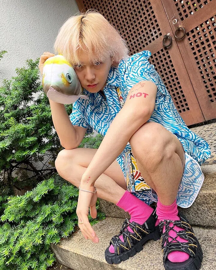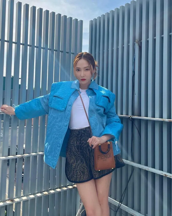 韩星Dawn打扮向来大胆,这身Fendi Vertigo蓝色FF老花纹衬衫及短裤。搭配彩色FF老花纹包装盒包,呈现极致的“花花世界”。