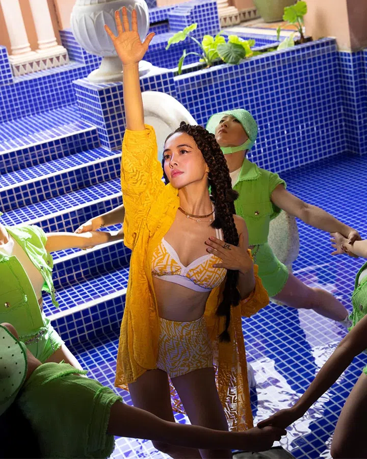 蔡依林在新歌《Stars Align》MV中率先穿上Fendi Vertigo系列bikini,在被抽空的水池内跳舞,演绎性感舞娘。
