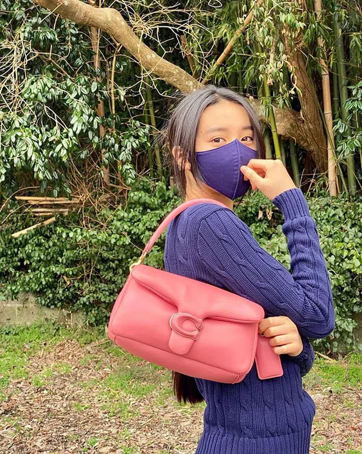 木村光希以休闲的深蓝针织套衫搭配桃红色Coach Tabby枕头包,大胆的撞色为慵懒的造型注入精彩视觉感。