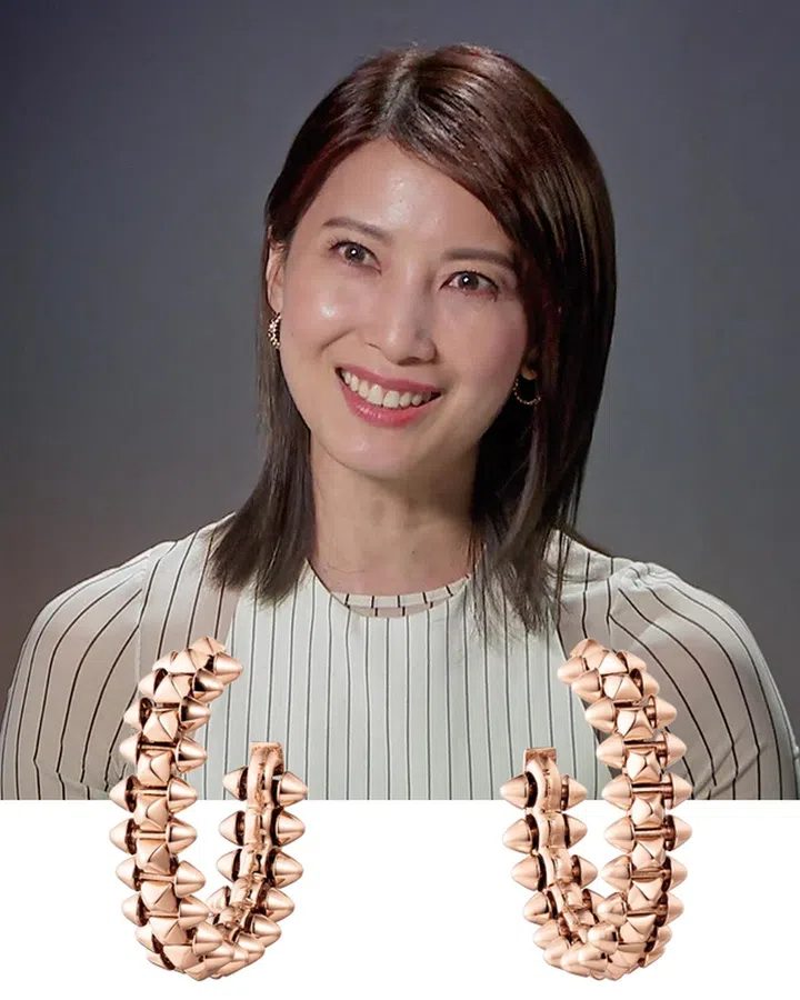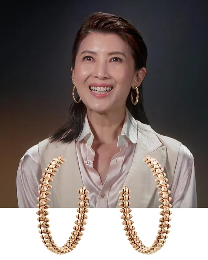 欧萱则是以低调的Cartier铆钉耳坠亮相,让人把焦点放在这身极具造型感的Sportmax条纹装。这款耳坠,其实跟她在首集中佩戴的Clash de Cartier为同款,只是尺寸不同。