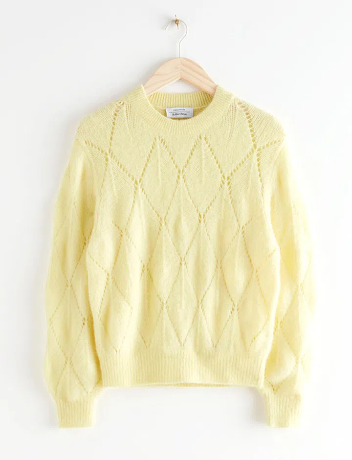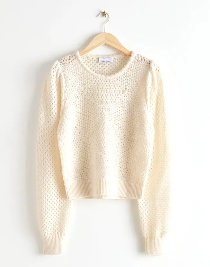 镂空花纹设计的针织衫,不仅散发优雅复古风,在本地穿着也更加透气、散热。在室内工作、学习的时候,也可以当作保暖衫套在衬衫、连衣裙外。