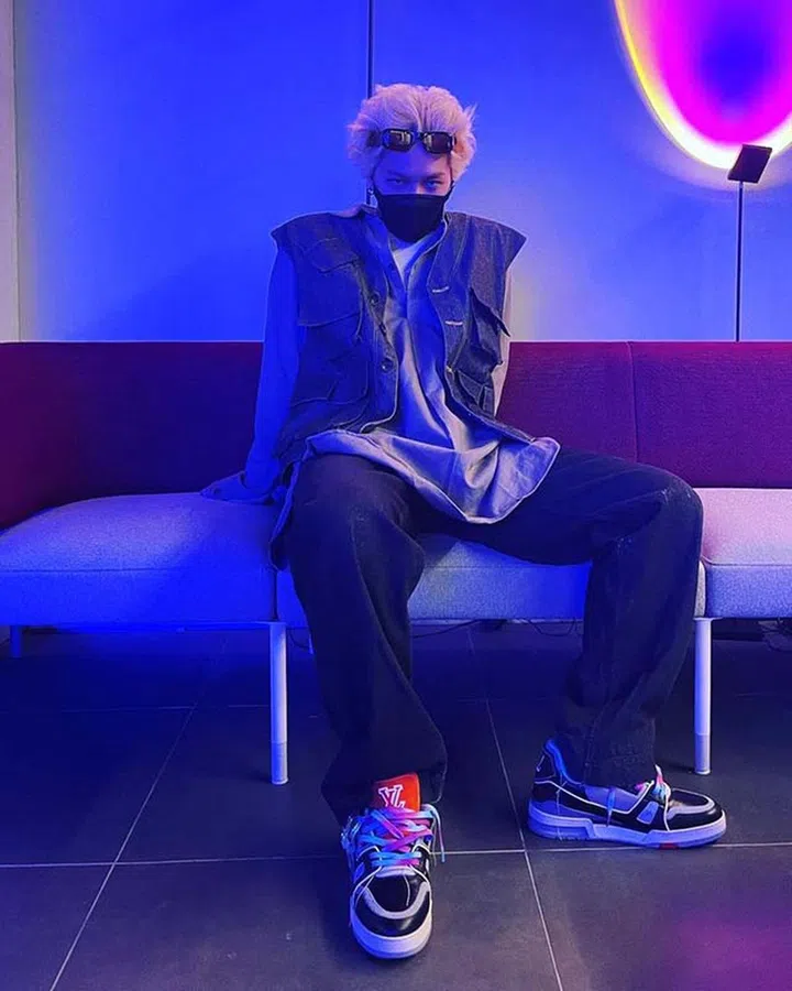 漂了一头金发的Mino在衬衫外罩超流行的工装背心搭配#LVupcycling球鞋,大展街头潮男态度!