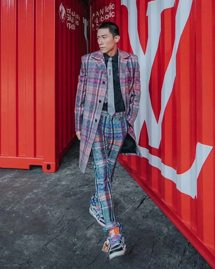 陈泂江以一袭Louis Vuitton 2021春夏一套式粉色格纹大衣及格纹长裤呼应#LVupcycling球鞋的粉色鞋带,虽为新戏剃了平头,但依然“粉”有型!