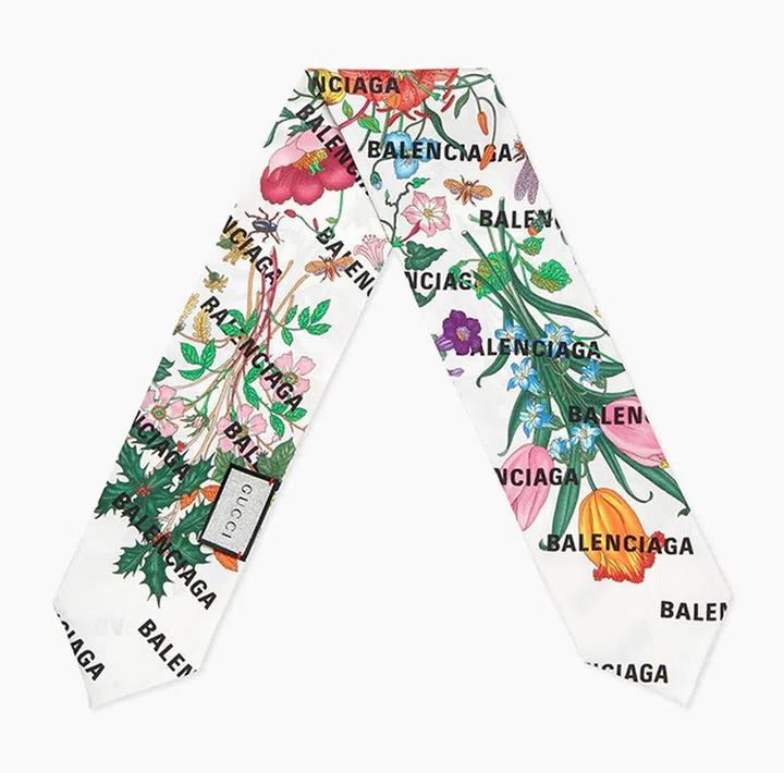 轰动时尚界的The Hacker Project (Gucci与Balenciaga品牌之间的DNA碰撞)中,Gucci创意总监Alessandro Michele以表达敬意的方式探索创意领域之间的无界限与真实性。在这款领结设计上,Gucci的Flora印花与Balenciaga的标志交织在一起,将两个品牌独有的创作理念融合在一起。