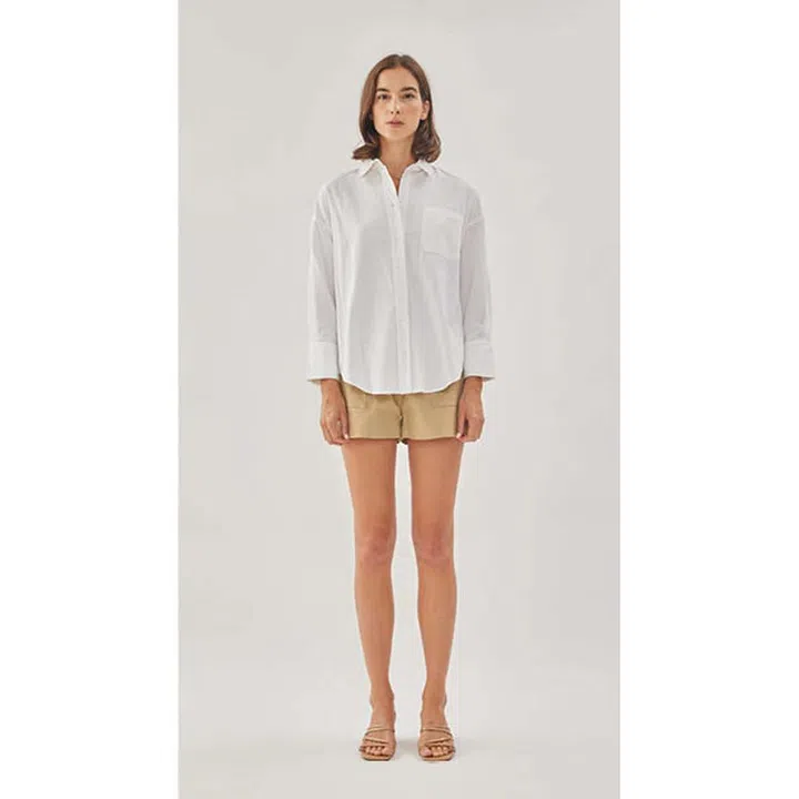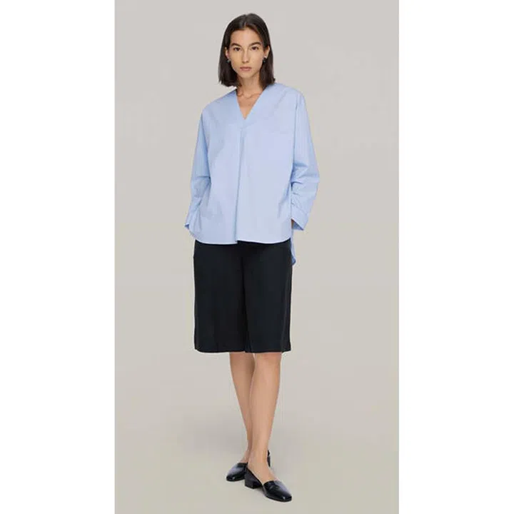 要更有休闲感,你可以解开衬衫的领口,或者选择这类V领的宽松设计。搭配百慕大短裤,再戴上一条精致的细链项链,整个造型随性又很french chic。