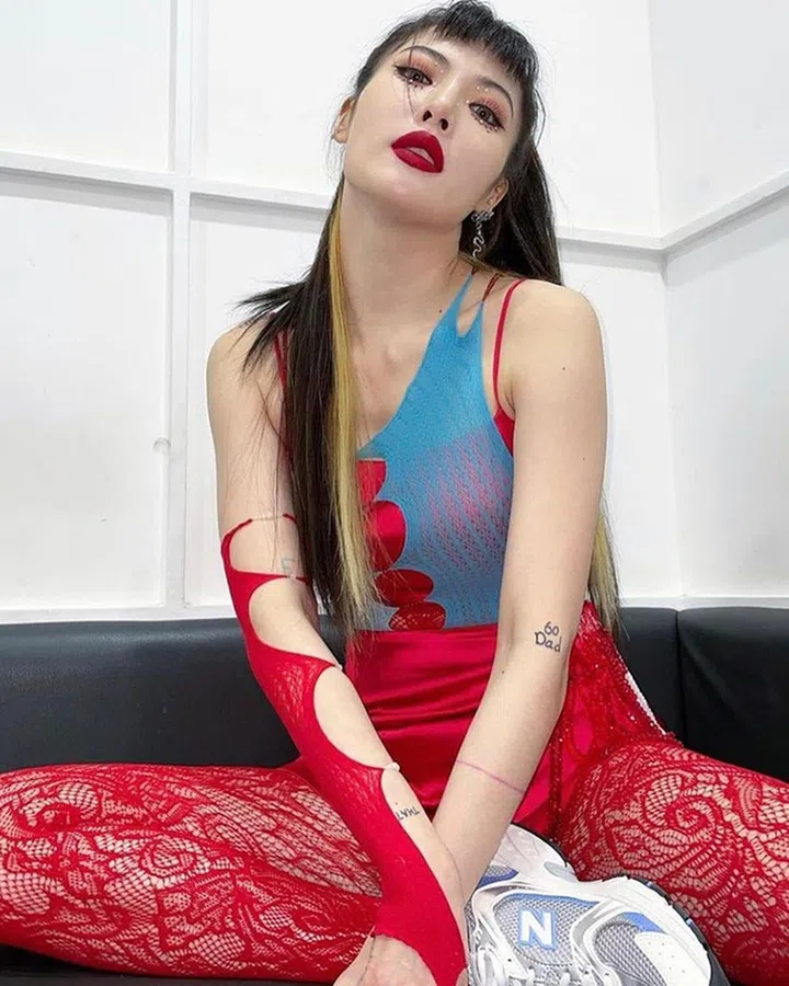 泫雅在早前MV《I'M NOT COOL》里的性感挖洞装也是出自Rui,吸睛的造型更让品牌瞬间上热搜。她后来在舞台演唱时,又穿了品牌另一款红蓝拼接的挖洞紧身装,大展性感舞娘范!