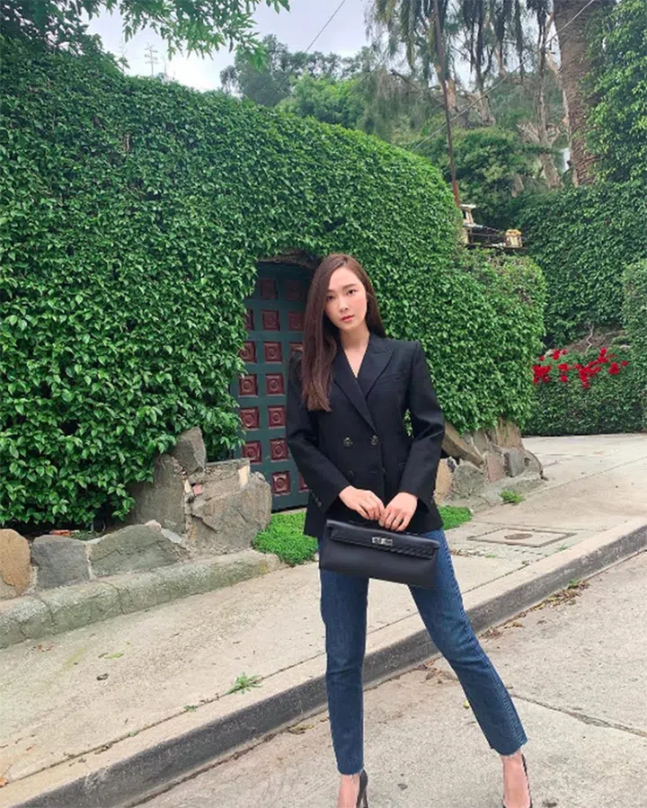这款HERMES Kelly手袋轮廓偏长,可以手提,也方便手握。Jessica穿着黑色Givenchy西装,搭配直筒牛仔裤及高跟鞋,这样的打扮也非常适合日常职场穿着。