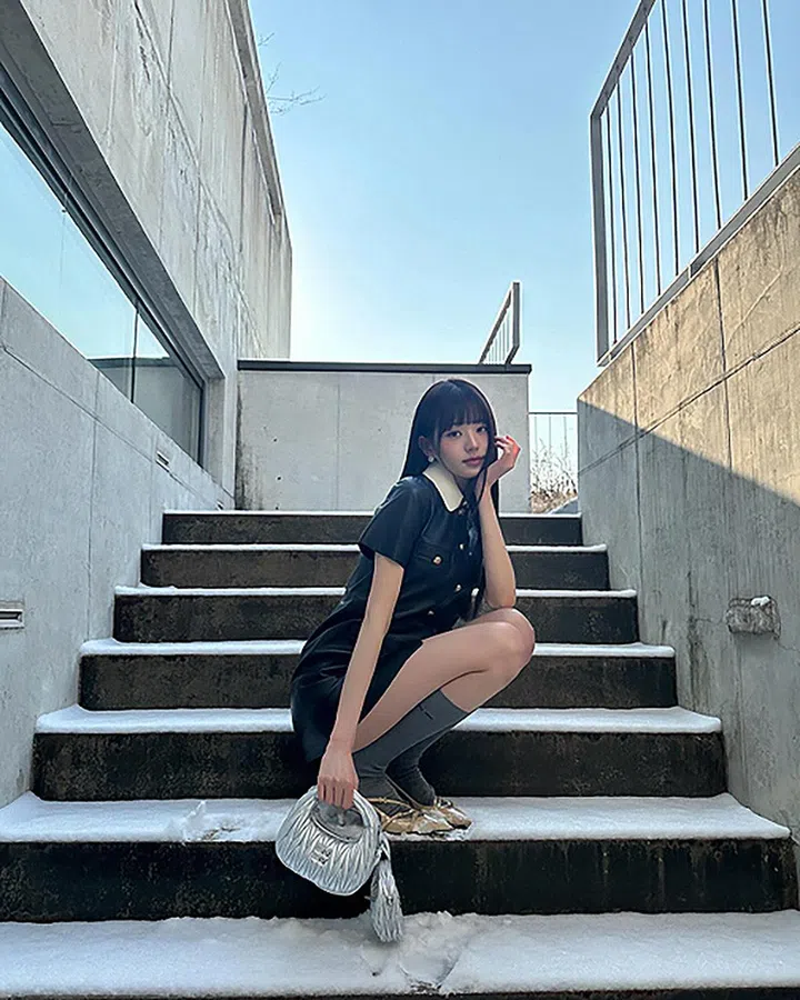 “人间Miu Miu”张元英,跨年之际穿Miu Miu搭配银色迷你Wander手袋——上面还另挂了一个micro尺寸的 Wander小袋,造型软萌又有趣。