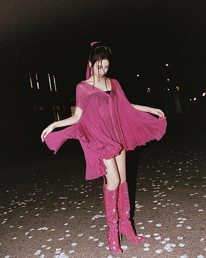 Jisoo告别2023,迎接2024。回顾照中这张亮粉色裙装,来自Rick Owens 2023春夏系列,是她在早前发布首张个人专辑《ME》在《꽃FLOWER》MV中所穿。充满量感又不失轻盈的丝质雪纺裙,搭配闪亮水晶缀饰长靴,舞动起来时格外抢眼。