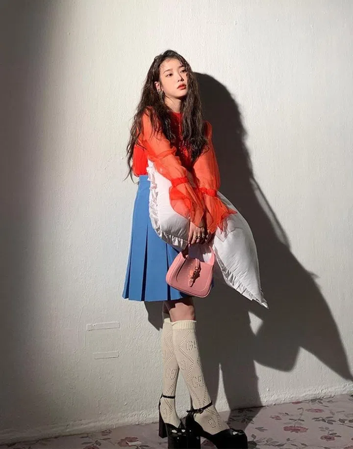穿红其实没这么难!大胆玩撞色,如IU这身Gucci红薄纱上衣+蓝色短裙+粉红Jackie 1961包,穿出缤纷又精彩的学院风!