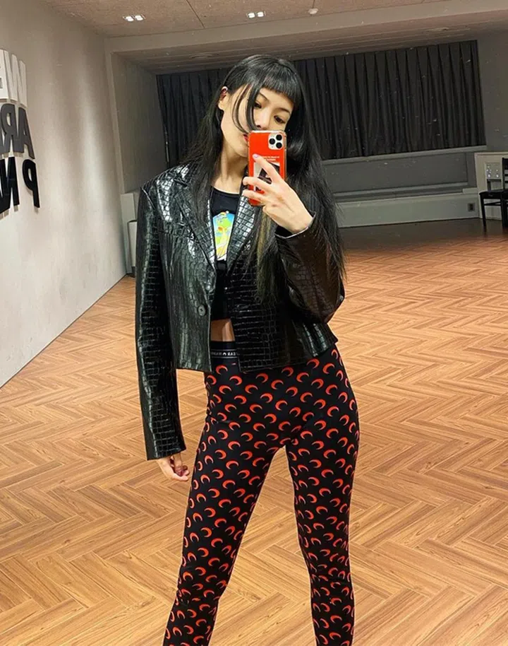 泫雅这身穿搭完美示范——穿红也可以很潮!学她穿Marine Serre标记性的红色弯月图案紧身裤,为酷帅的黑时尚注入一点红!