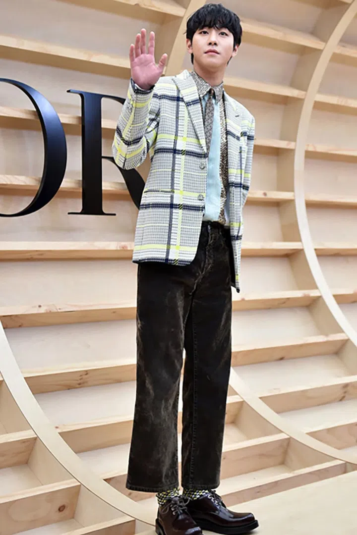 丁海寅频频出现在韩剧荧幕上,《雪降花》中与Jisoo的互动更是让人心动。丁海寅将自身的街头风格注入造型中,出其不意地将两种碎花印花搭配,再以“长青”的棕色与牛仔中和,整体造型上恰如其分。
