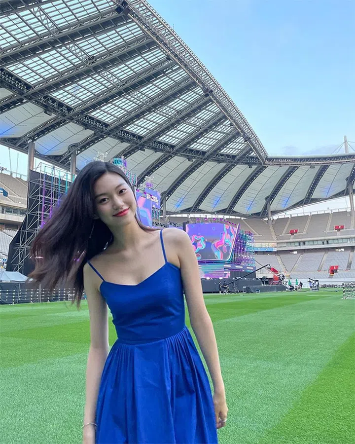 比如上图Karina穿着Givenchy红色短版飞行员外套及高腰长裤,且从内到外都是醒目的红色,造型更显前卫。