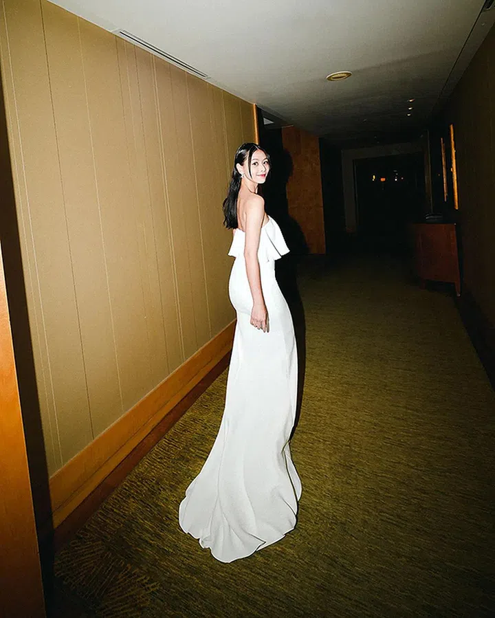 何盈莹近期不少礼服造型都可圈可点,比如之前出席Cartier Into The Wild展览的腰部挖洞黑色礼服,Lancome活动穿着的露背白色连衣裙,还有曳地显高,且修饰身材(荷叶边装饰无论对大胸小胸都很友好)的优雅白裙。