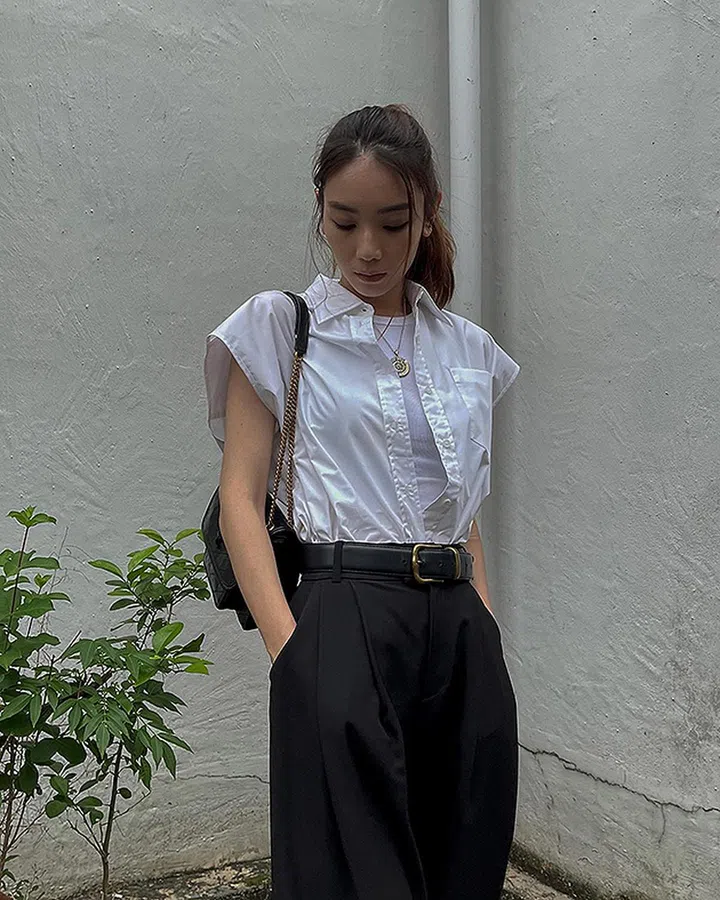 黄思恬最近两个造型都采用白色+咖啡色/米色的搭配,其中一个以白衬衫打底+Dior外套及不对称长裙,这身服装则以吊带小白裙加咖啡色/米色休闲西装,打造轻松的都市休闲造型。