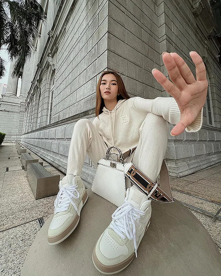 今年20岁的本地新生代艺人叶佳昀,以一身米白针织休闲装搭配同色调球鞋及Fendi Peekaboo手袋,展现Gen Z的时尚活力及随性感。