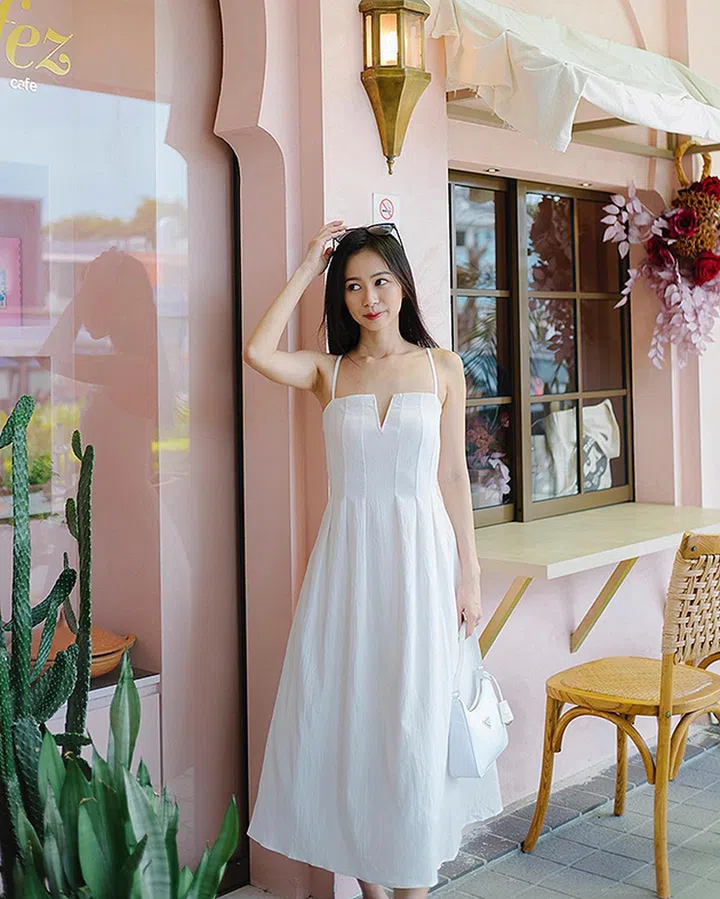 换上吊带连衣裙,Bonnie就展现出她甜美的一面。上衣部分在视觉上制造如同胸衣般的塑形效果,让造型既简约又展现一丝性感。