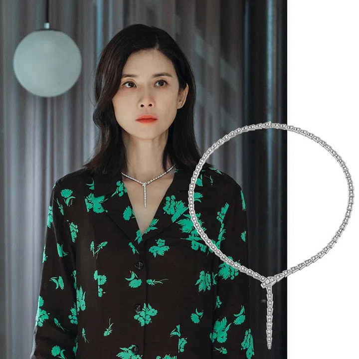 不得不说,李宝英在豪宅内的“居家珠宝”,还比外出戴的更高价。她在这幕戴的是Bvlgari标记性的灵蛇钻石项链。