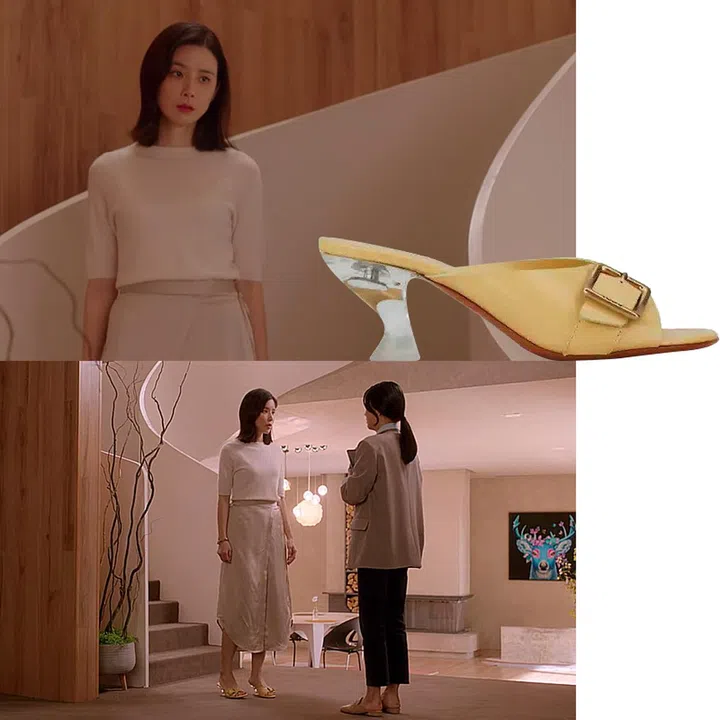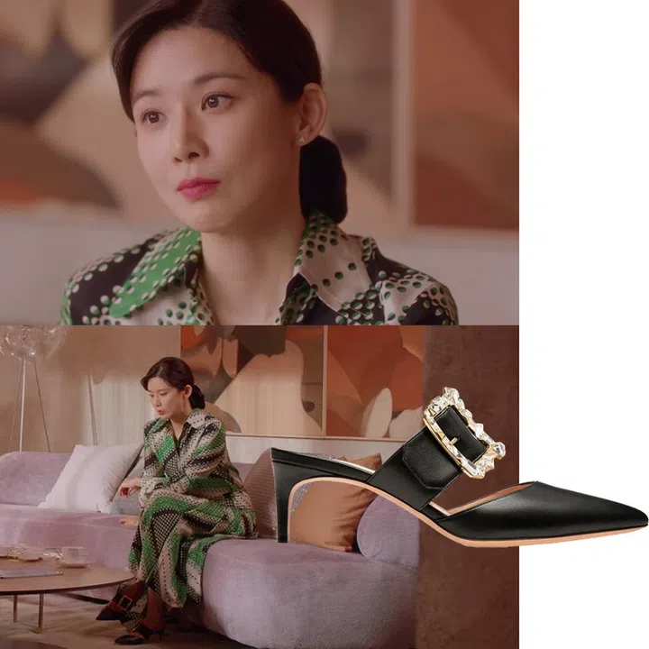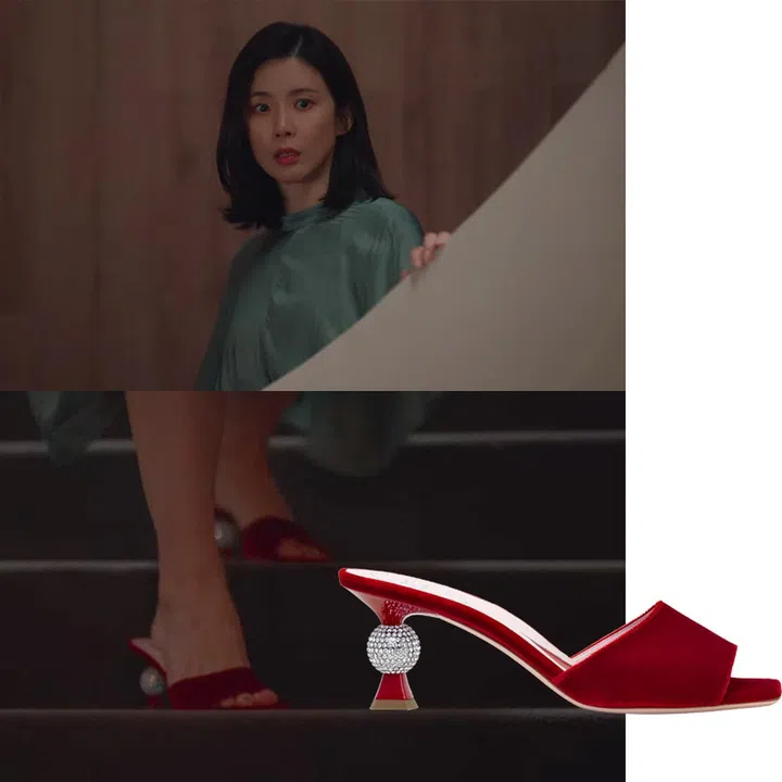不得不说,剧中李宝英在家里穿的“室内拖”都很厉害。尤其这双Salvatore Ferragamo春夏主打的F-heel出镜率极高,前三集女主在家几乎都穿上它!