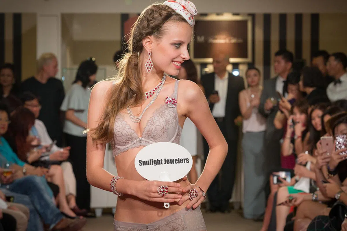 19 Oct 2015珠光宝气的内衣秀Singapore JewelFest 2015,首次呈现内衣品牌Triumph与德国珠宝商Hans D Krieger Fine Jewellery和Esvara Viva珠宝品牌联手合办的时尚内衣秀。NUYOU Teamdiamondsfinejewellerygemslingerierunway女模穿上Triump与Esvara Vivia联手设计的珠宝内衣,并穿秀出Sunlight Jewelers的珠宝首饰闪耀登场刚落幕的这场时尚内衣秀,将主题设定为红白色,以凸显豪华和高雅感。女模穿上走秀的是Triump最新的ESSENCE系列,并且首次在珠宝展亮相。两大珠宝品牌用来装饰内衣的珠宝包括钻石、红宝石、尖晶石和其他红白色宝石。这次走秀的内衣设计,在剪裁方面用了蕾丝突出细节,同时以质感平滑的布料衬托出优雅气质,更凸显女人的身型。 分享文章: