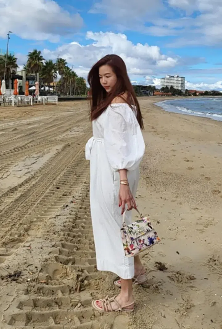 来到海边的瑞恩,配合好天气换上了一袭清新的白色连衣裙,手里拎着来自Furla的1927迷你型花卉印花手袋,在沙滩上漫步。