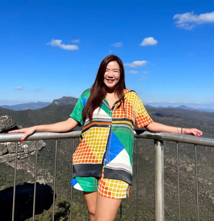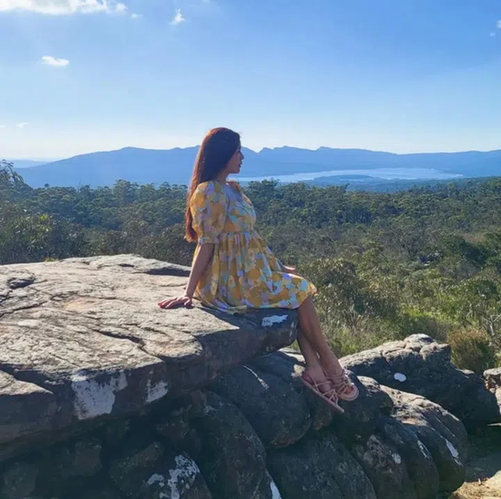 瑞恩穿着一身花卉印花连衣裙搭配凉鞋,坐在宏伟的格兰坪国家公园(Grampians National Park)大石上。整个画面绽放着纯粹的积极、快乐与平静的氛围。