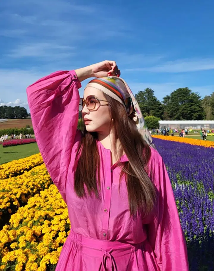 旅行中的第一个造型,她穿上澳洲品牌Bird & Knoll的紫红色套装,以Furla丝巾作为头饰,呼应了背景中那一大片绽放着的鲜艳花卉。