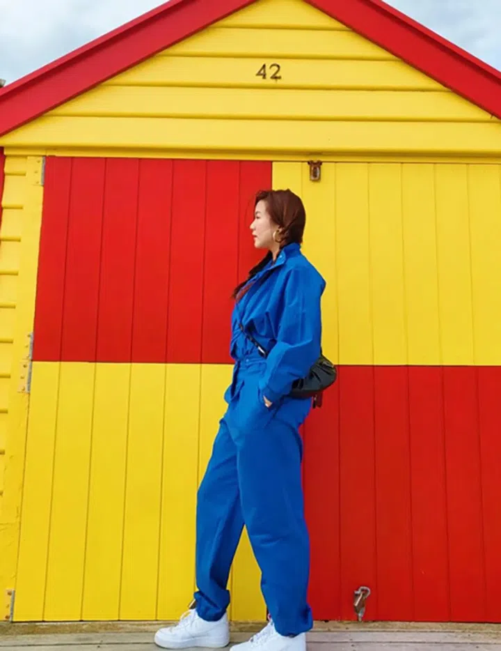 除了一件式套装,瑞恩也在旅行时穿上了搭配基本款——休闲西装外套+牛仔裤!虽然是基本款穿搭,但瑞恩特别选了超亮眼的色系,巧妙穿出“亮”点。