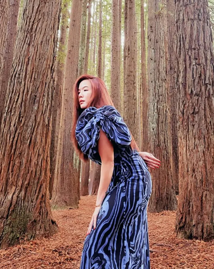 在幽静的树林里,瑞恩身上来自丹麦时尚品牌ROTATE的印花连衣裙格外醒目,不规则的花纹更是巧妙呼应了树木上的纹路。