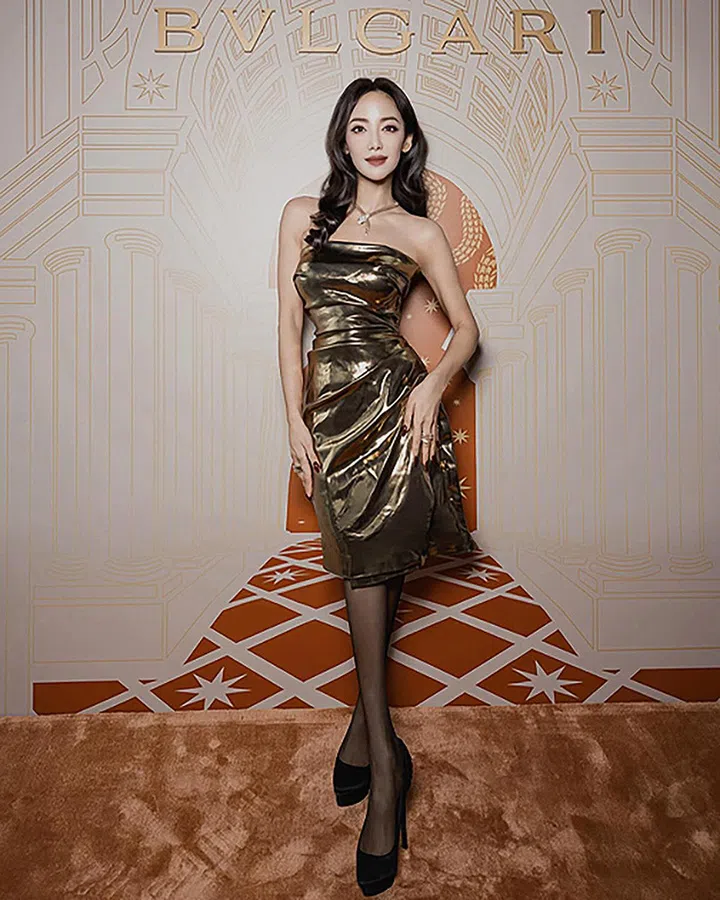 谢宛谕11月出席Bulgari活动,也选穿金色系裙装亮相。裙子的金属光泽质感与她肤色的温暖色调形成了漂亮的对比,而且服装的光泽反射也让她在灯光下显得格外抢眼。