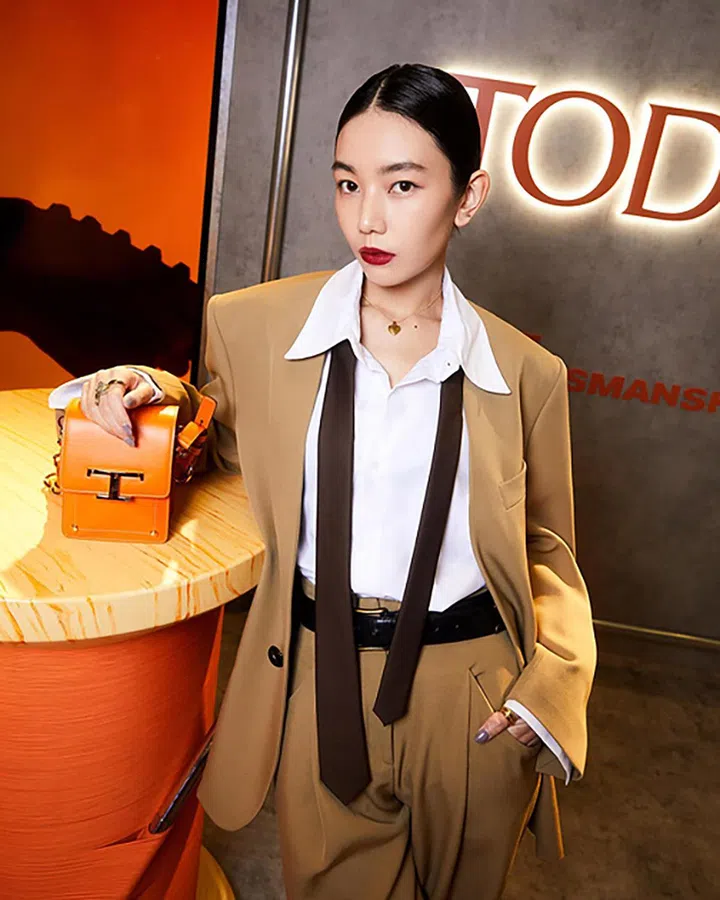 领带也未必要系上。洪丽婷出席在本地举行的TOD’S Tim Walker Exhibition(当晚Tod's品牌大使Joy和泰国男星Blue也有到场助阵),以咖啡色西装套装及白衬衫、黑领带造型亮相。所携带的手袋,则是品牌新推出的T Timeless Bag 。