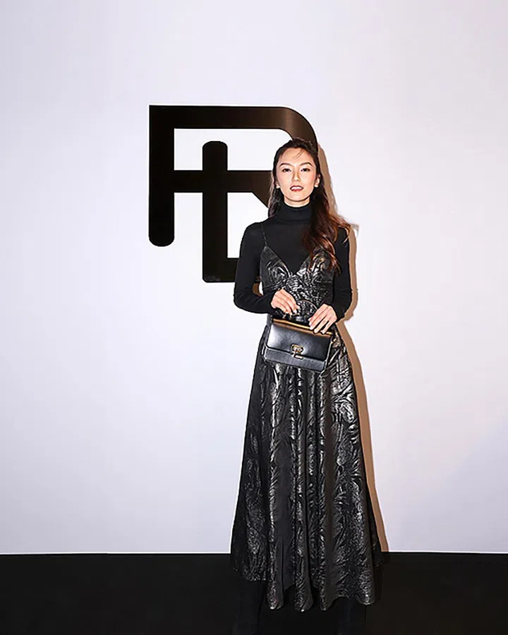 白薇秀当晚选择以深色系裙装及黑衣亮相,长裙上的金色图案,在Ralph Lauren暖色调的环境中里显得格外和谐、迷人。