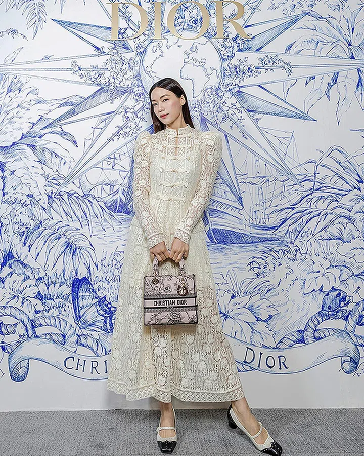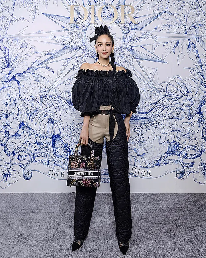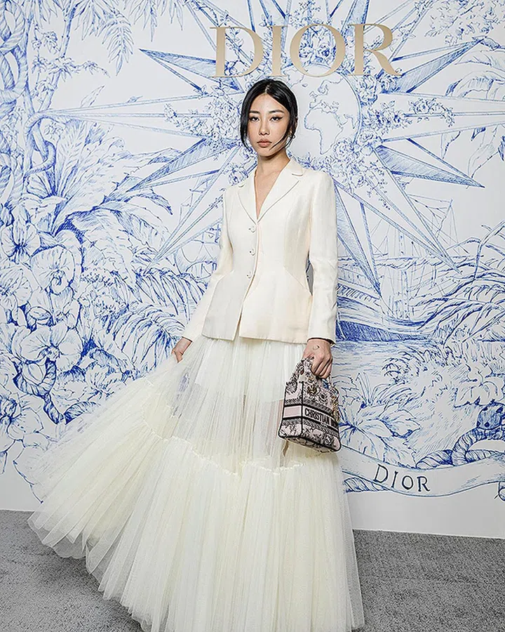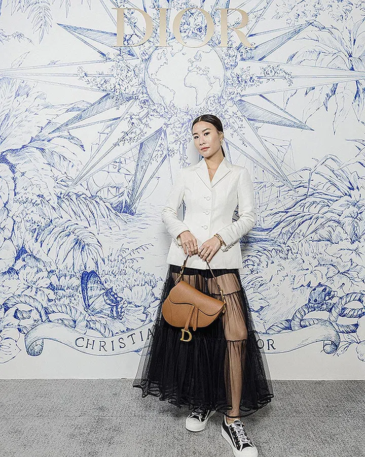 同样以bar jacket+纱裙出席的Salina,选择黑白组合,纱裙的透视效果极为显著——可内搭品牌短裤,同时展现时尚性感与动感活力。而她手上的皮革saddle bag,也有更多丰富设计,如今季主打的Ornamental图案及Rêve d’Infini图案。