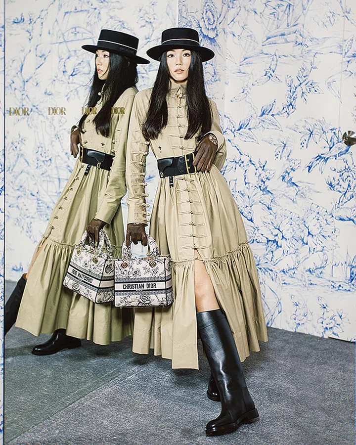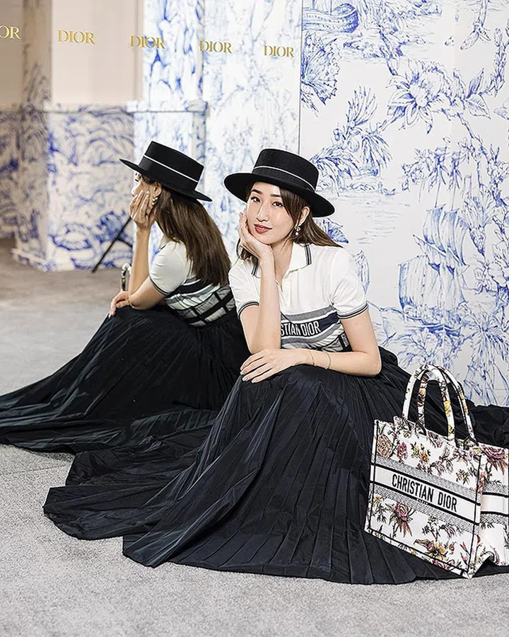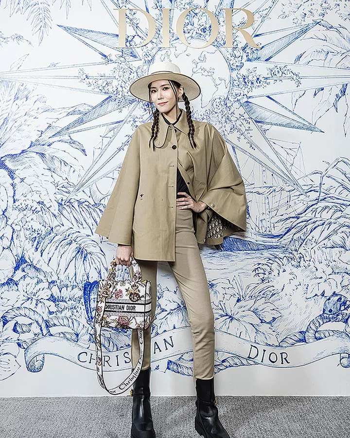 本地时尚达人Yoyo,穿着风衣风格的帅气长裙,搭配马术主题的Empreinte皮革马靴(riding boots)及Diorodeo帽。手上的袋款则是今季Dior Jardin Botanique刺绣图案的Lady D-Lite手袋。