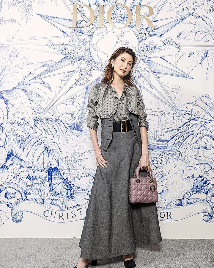 欧萱则以帅气的马甲及长裙亮相,内搭波点衬衣,俏皮的款领结衣领为英气十足的造型注入一丝甜美。另外,她腰间的Saddle belt也是今季的要点配饰,腰带两侧分别带有一个小翻盖包及一个拉链口袋——虽然放不下手机或口红这类较厚物品,但装信用卡和钥匙出门绝对没问题。