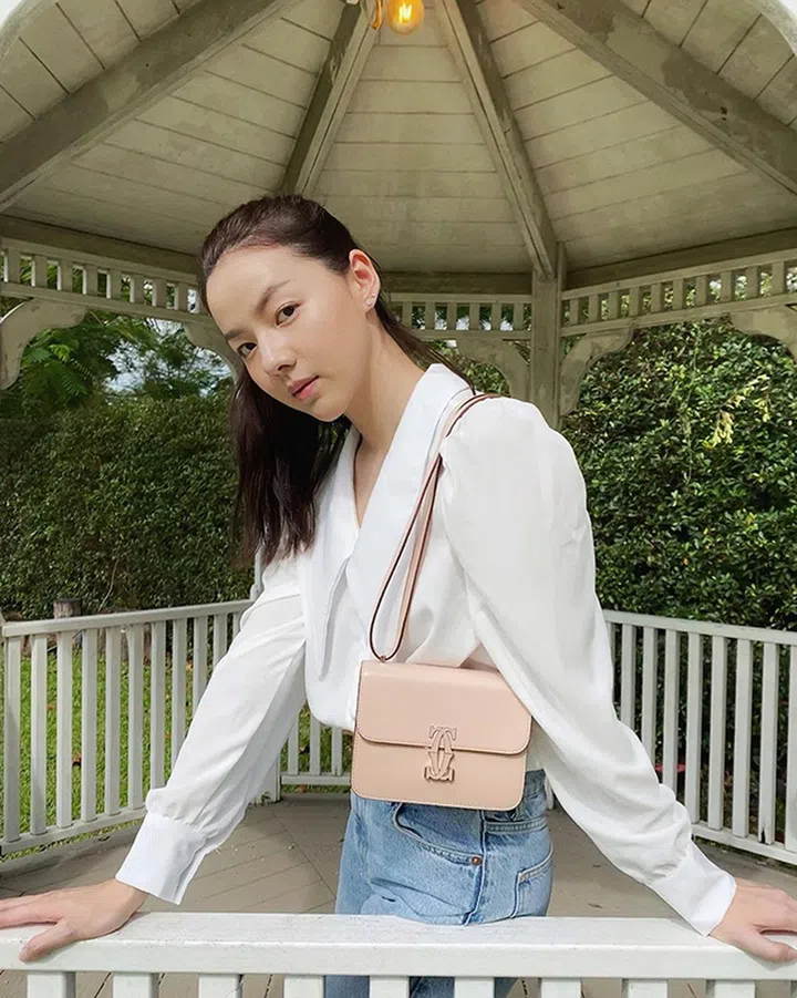 对于手袋上的这个“双C“标志,品牌让其脱离以往在手袋上的椭圆造型应用,以更加现代的logo式设计进行演绎,展现出珠宝一般的风格魅力。Jasmine选择的柔和粉色,很能衬托她清新自然的气质。
