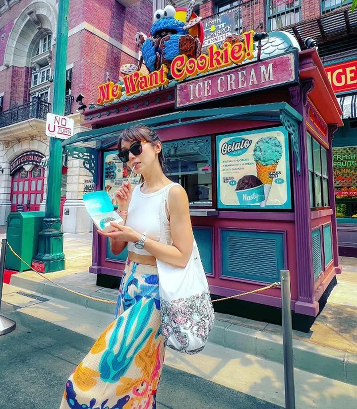 换上色彩鲜艳的衣服,其实就很有夏日风。黃暄婷的这身针织上衣,绿+黄+紫的缤纷色彩,在视觉上很清爽。