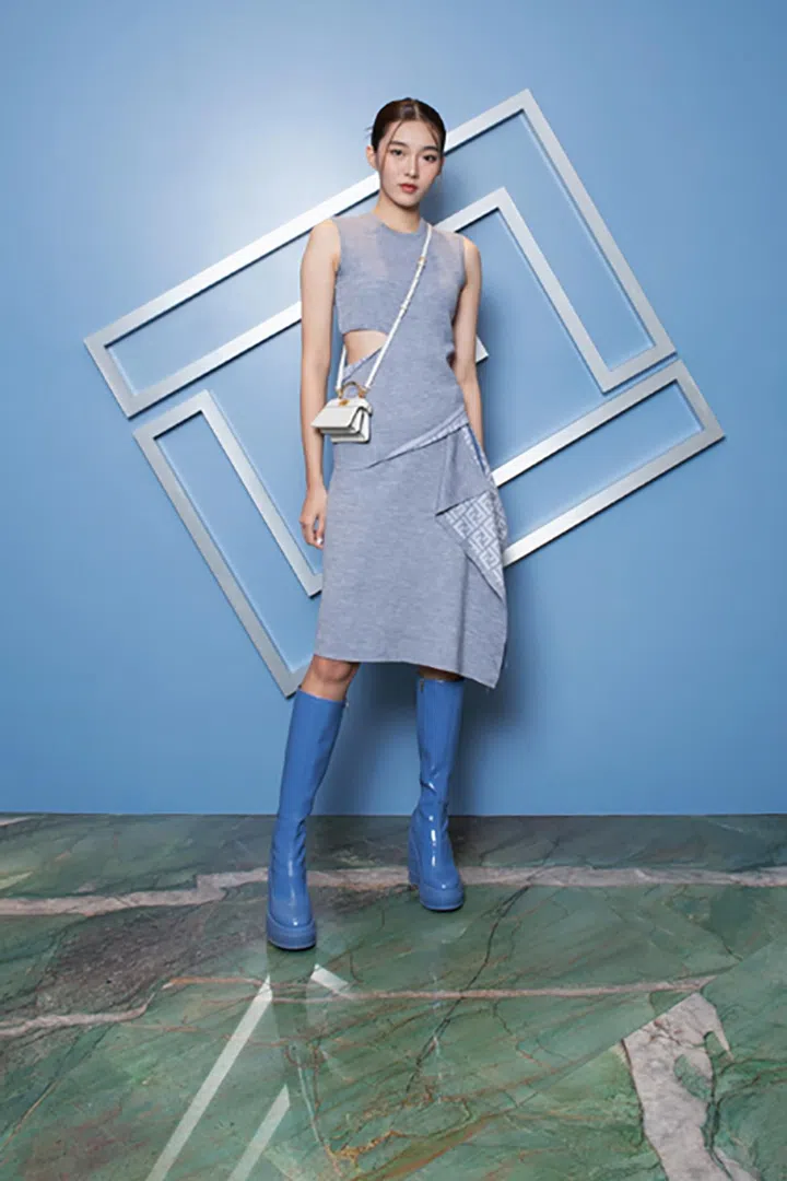 身材高挑的叶佳昀,身穿品牌今季系列的“挖洞”灰色连衣裙。腰间与裙摆处微微露出内里的FF图案,低调演绎monogram时尚。同时,这身造型也搭配了今季鞋跟带超大FF标志的技术漆皮长靴,以及品牌早前推出的超迷你Peekaboo ISeeU Micro手袋。